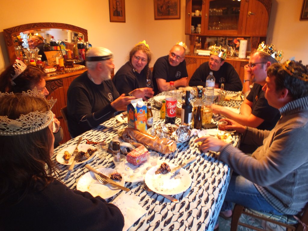 A peine arrivé, point de couronne sur la tête de notre troll. Alors notre ami s’est vu remettre une fraise à porter sur l’instant. Et ce n’était point le fruit mais bien une non moins magnifique collerette de la couleur la discrète qui soit, un eau jaune fluo. Notre bien aimée secrétaire n’a pas pu venir en moto au motif d’un lumbago ; ce qui se comprend. Mais ce qui me gêne dans cette histoire, c’est l’origine de ce mal au dos. Il paraît que cela lui est arrivé alors qu’elle était au lit. Or elle ne s’y trouvait pas seule soit-disant ; si bien que toutes les filles du groupe en voulait un….C’EST MOCHE…